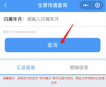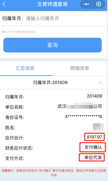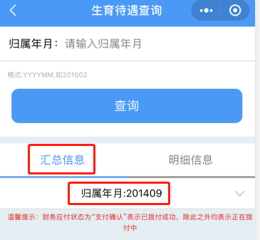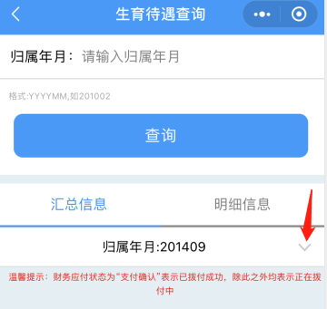 (一)点击箭头“∨”后,参保人该笔归属年月的生育保险待遇的具体金额、拨付及发放方式等情况将一一展示。“财务应付状态”为“支付确认”表示已拨付成功,除此之外均表示正在拨付中。