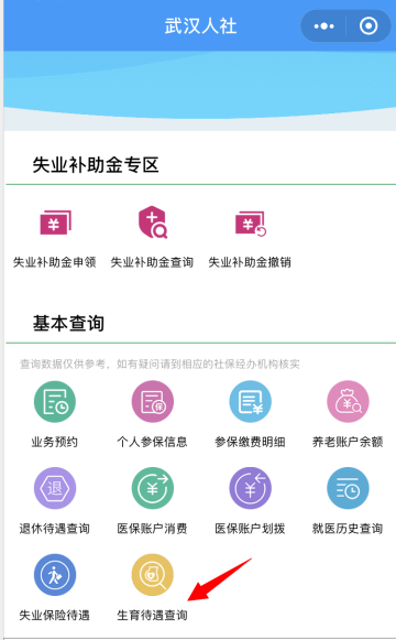 参保人通过本人手机支付宝或微信搜索“武汉人社”小程序,点击进入,在“基本查询”项目里选择“生育待遇查询”点击进入。