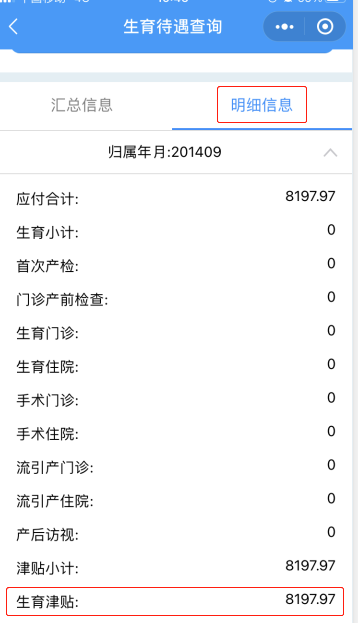 (二)生育保险待遇明细信息展示。在“明细信息”栏点击箭头“∨”后,参保人该笔归属年月的生育保险待遇的具体待遇类型及金额将一一展示。
