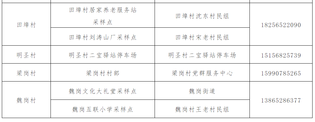 冶父山镇各村(社区)采样点地址及联系电话
