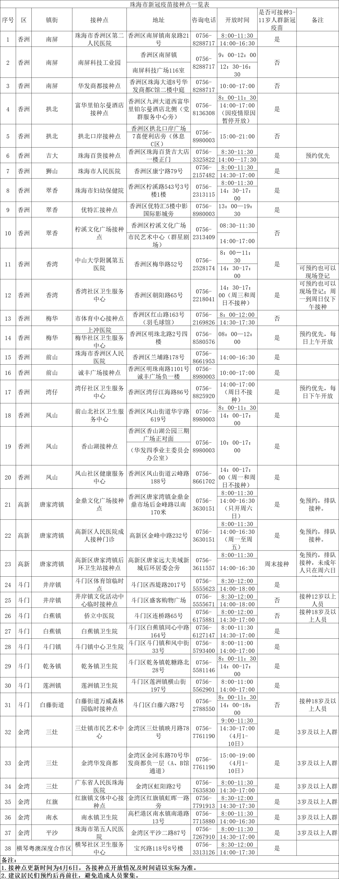 珠海市新冠疫苗接种点信息一览表(不断更新)