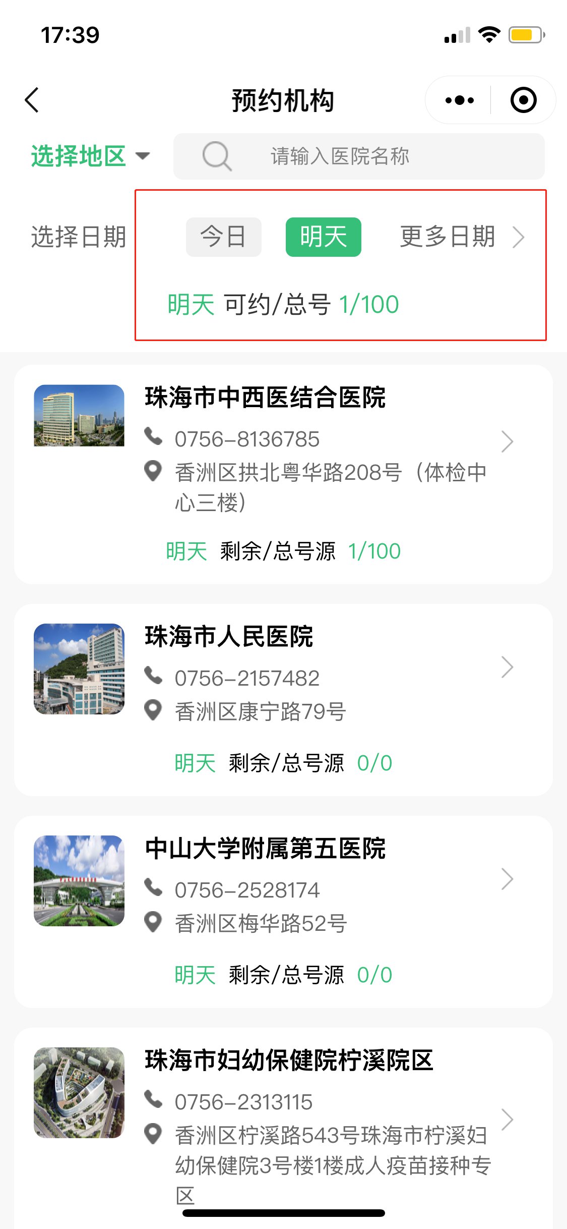 步骤3:查看今日、明天放号数量,然后选择预约机构;