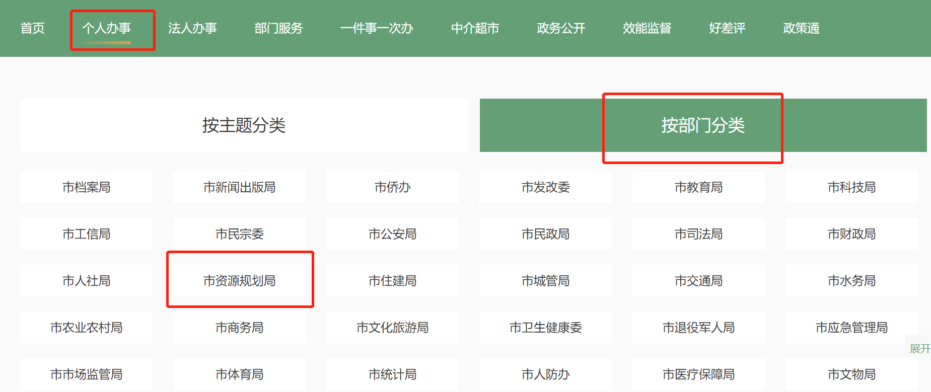 二、点击【个人办事】—【按部门分类】—【市资源规划局】