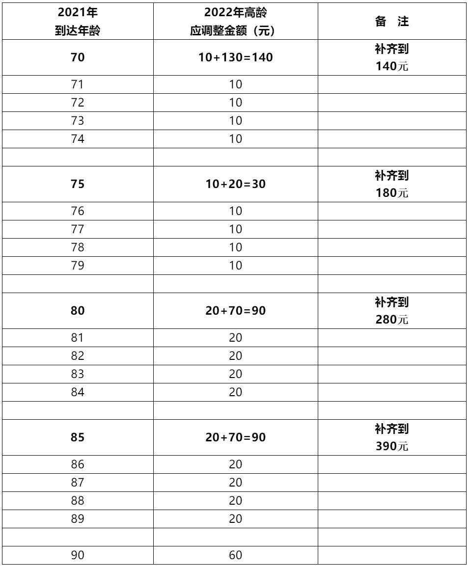 截至2021年12月31日,年满70-79周岁的退休人员每人每月增加10元,年满80-89周岁的退休人员每人每月增加20元,年满90周岁及以上的退休人员每人每月增加60元。其中,对2021年到达70周岁、75周岁、80周岁、85周岁的退休人员,按照上述办法倾斜调整后,累计享受高龄倾斜部分低于140元、180元、280元、390元的予以补齐。具体倾斜标准见下表: