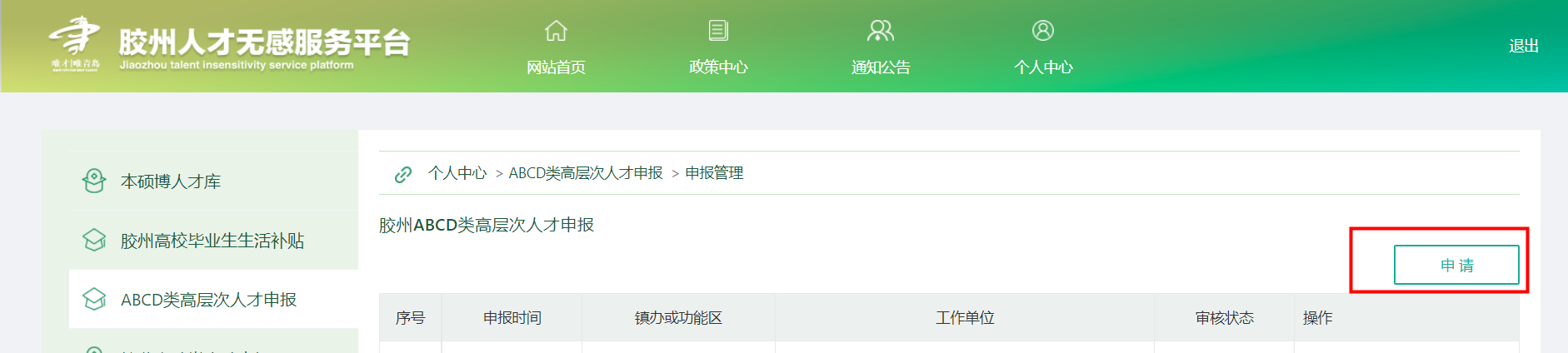 (1)登录“胶州人才无感服务平台”(>>>点击进入平台),点击上方【个人中心】切换到ABCD类高层次人才申报入口。