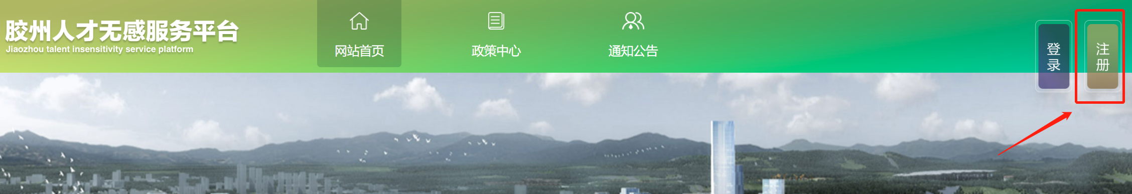 1.通过谷歌或火狐浏览器访问“胶州人才无感服务平台”(>>>点击进入平台)后,点击页面【注册】按钮。