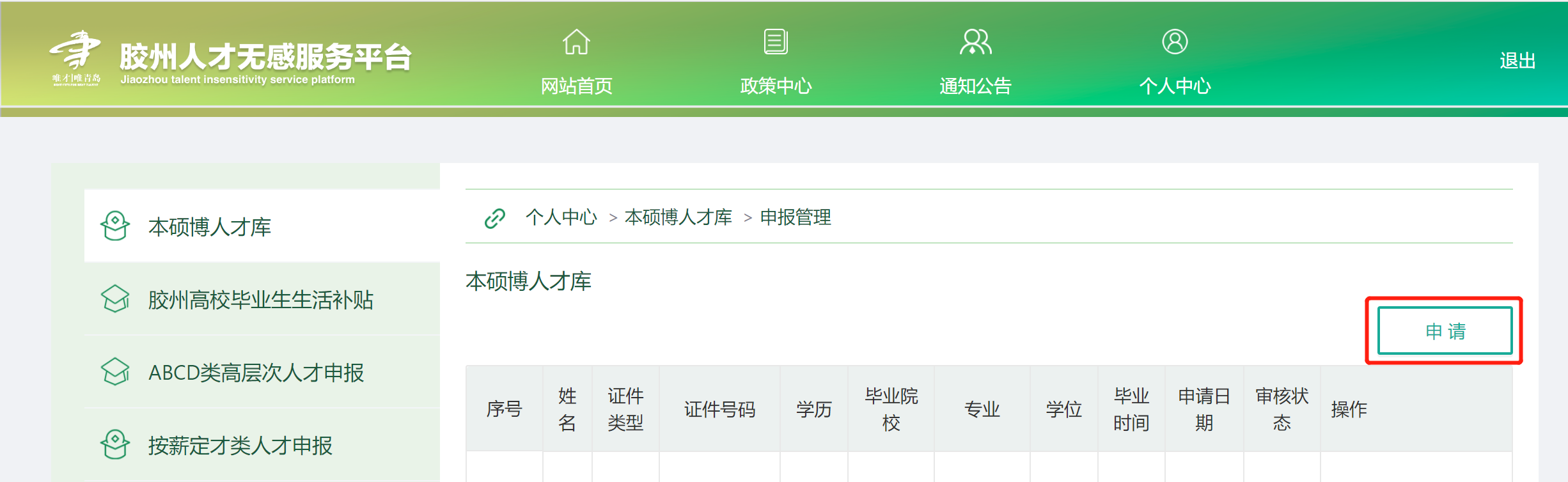 (1)完成本硕博人才认定并通过审核后,登录系统进入到【个人中心】,点击【胶州高校毕业生生活补贴】进入生活补贴申请主页面。