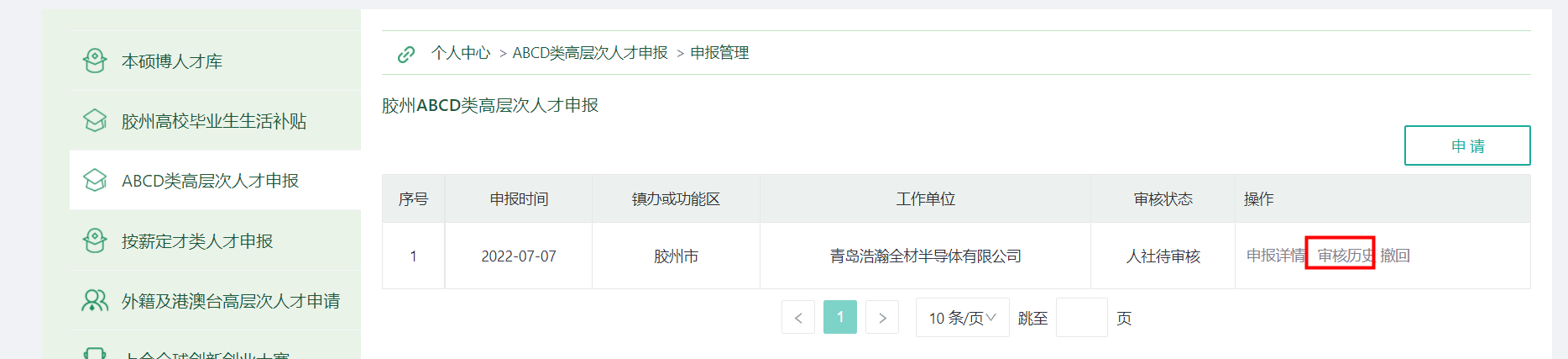 (4)完成人才认定申请后,系统跳转到ABCD类高层次人才认定页面,可以看到申请的记录。通过【审核状态】信息查看具体的审核进度,通过【审核历史】可以查看具体申请审核过程。