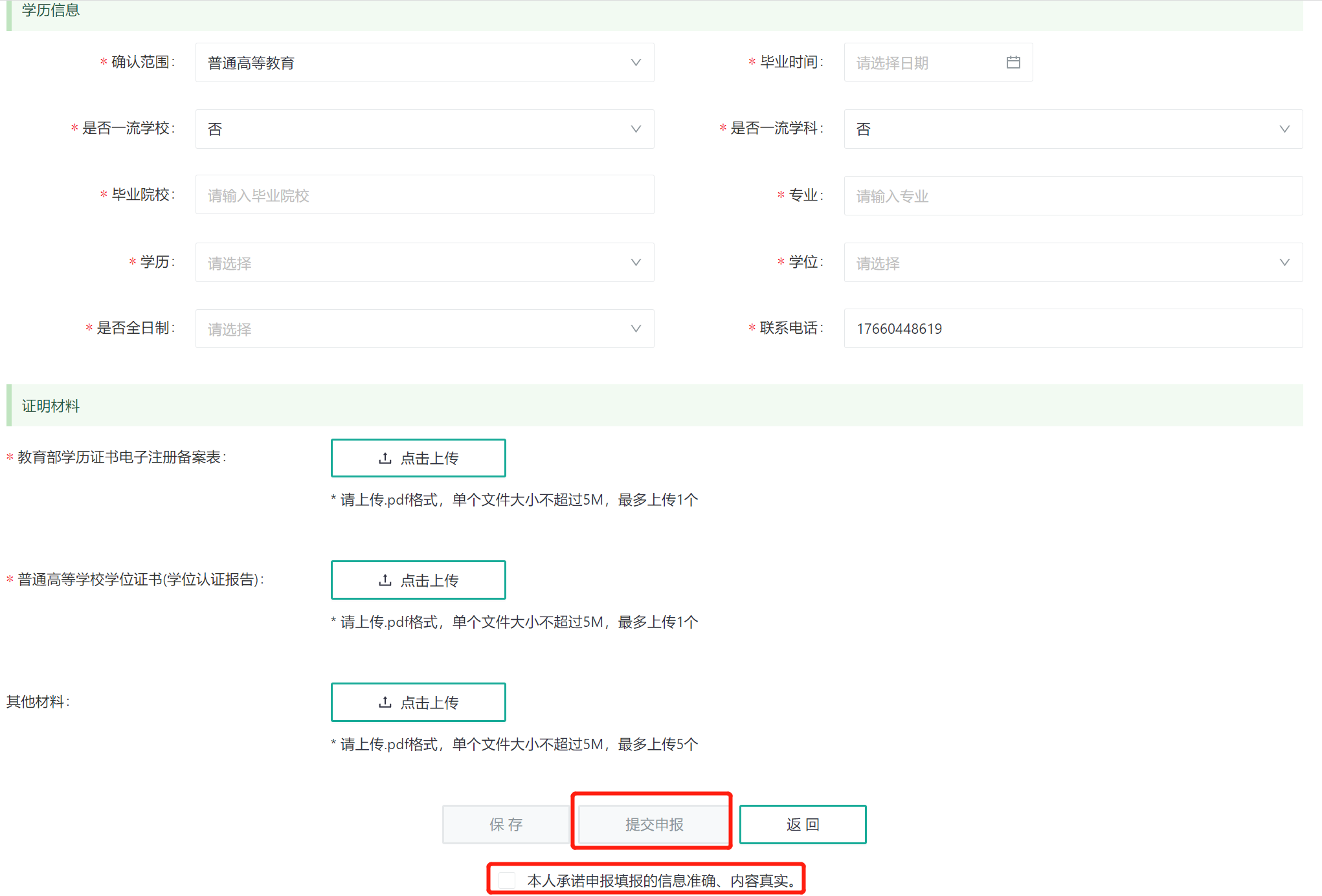 (3)点击【申请】,进入本硕博人才申请页面,填写学历信息,上传证明材料后,勾选最下方的本人诚信承诺,点击【提交申报】,即可完成人才认定申请。