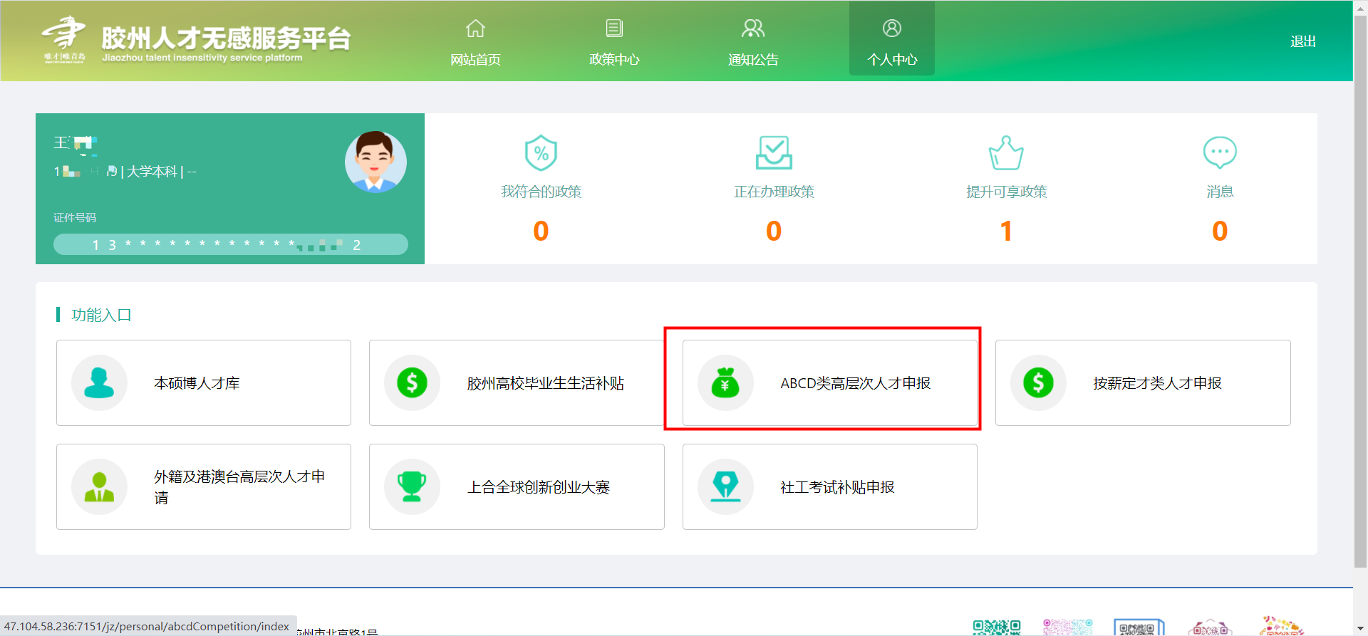 (1)登录后点击上方【个人中心】切换到ABCD类高层次人才申报入口。