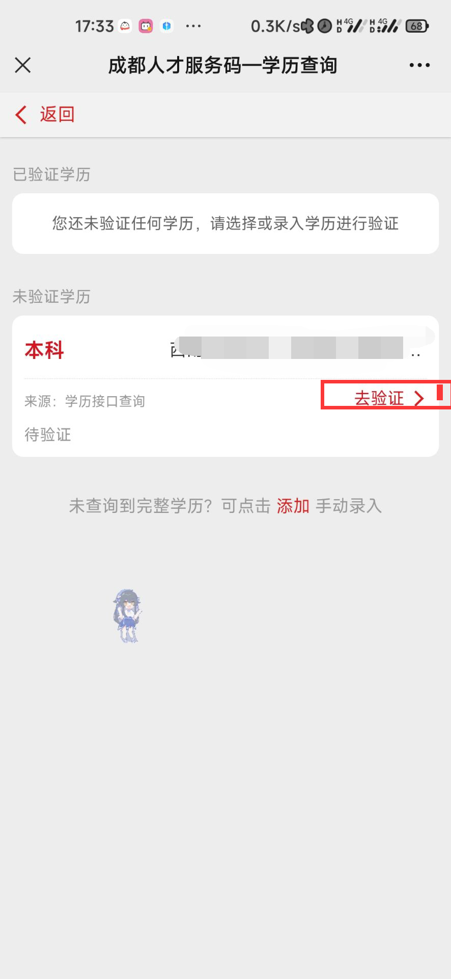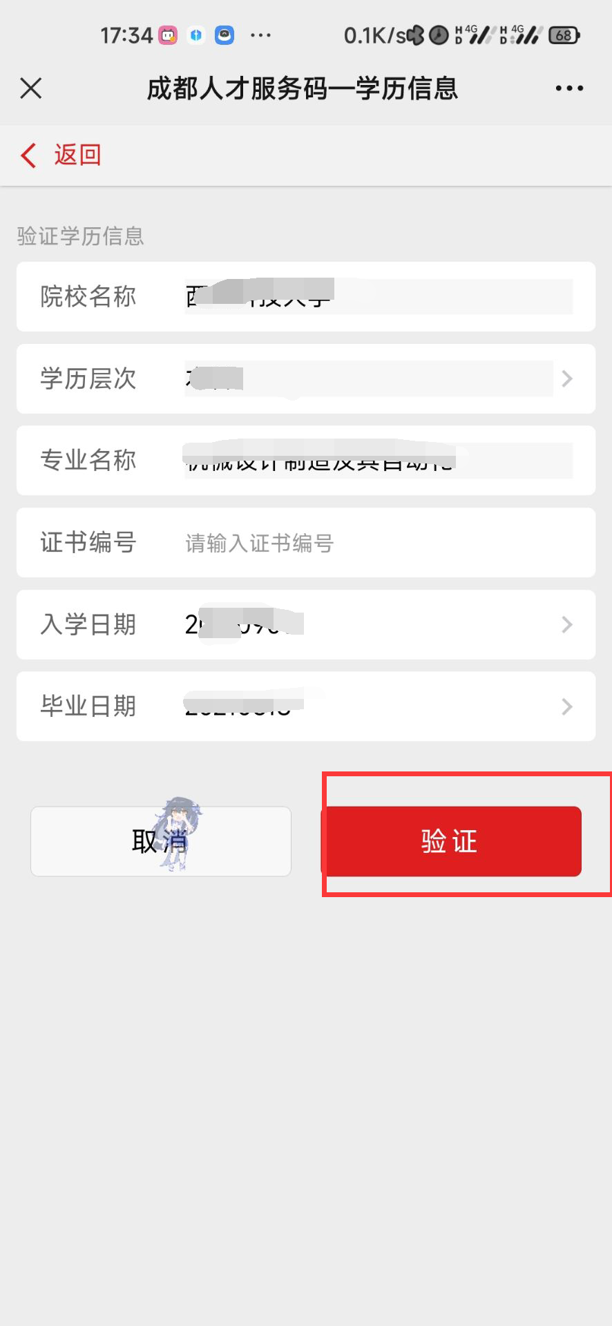 进入登录后,进行学历验证,重新扫码一次上面的码就可获得成都人才服务码