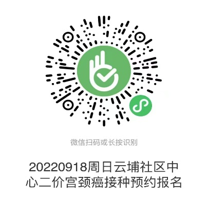 为更好的服务居民,预防宫颈癌。云埔街社区卫生服务中心9月18号二价宫颈癌疫苗接种专场来了。扫描以下二维码就可为自己或家人报名预约了。