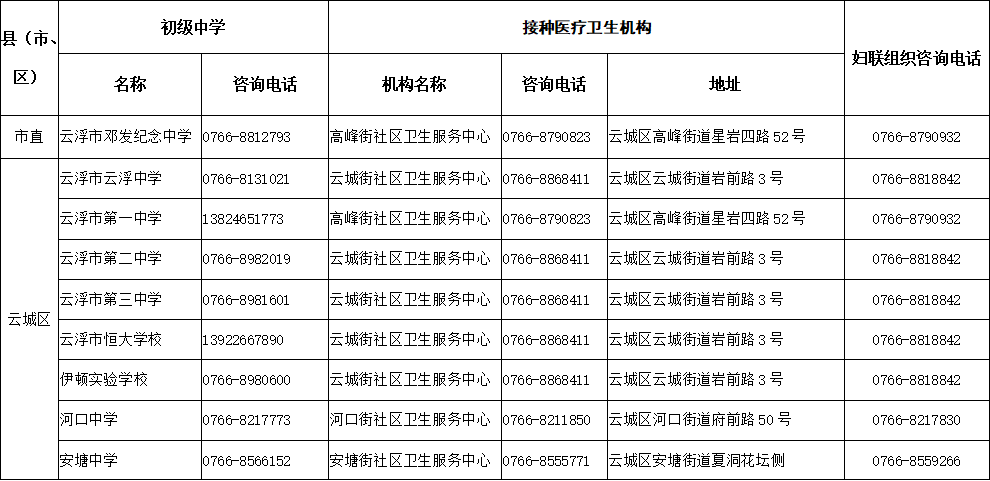 云浮市2022年适龄女生HPV疫苗免费接种指定单位和咨询电话