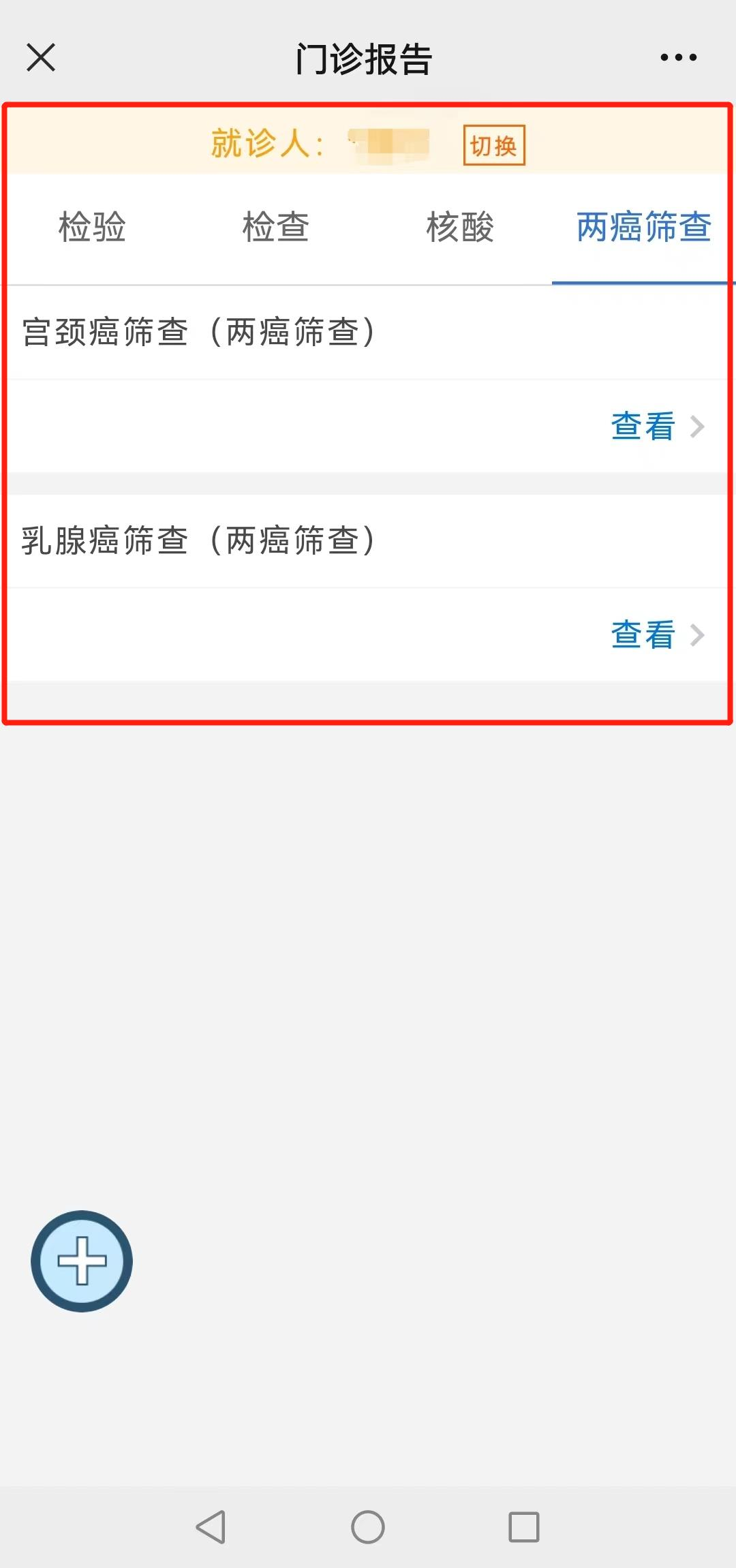 第二步:在医院公众号“医疗服务”中,选择“检验检查报告”。在“门诊报告”栏选择“两癌筛查”,分别查询宫颈癌筛查(两癌筛查)、乳腺癌筛查(两癌筛查)结果。