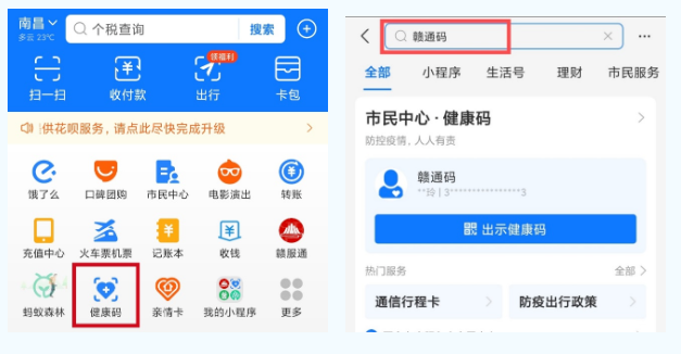 支付宝首页点击”健康码“或支付宝搜索“赣通码“进入;