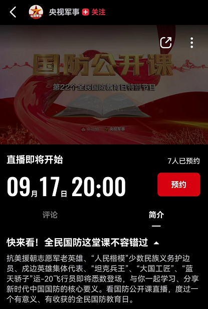 抗美援朝志愿军老英雄、“人民楷模”少数民族义务护边员、戍边英雄集体代表、“坦克兵王”“大国工匠”、“蓝天骄子”运-20飞行员即将悉数登场,与你一起学习、分享新时代中国国防的核心要义。看国防公开课直播,度过一个有意义、有收获的全民国防教育日。