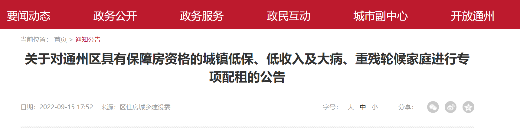 2022年9月北京通州公租房专项配租房源信息(附租金)