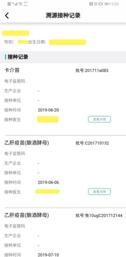 这个功能可以查看宝宝接种过的疫苗的详细信息,点击查看详情,就可以看到该针次疫苗接种的所有信息,包括疫苗生产企业、疫苗批号、疫苗监管码、接种单位、接种时间、接种医生等。