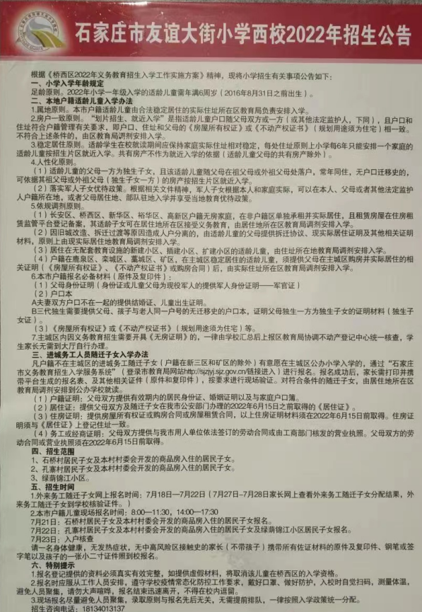 2022石家庄友谊大街小学西校招生简章(石家庄友谊大街小学2021年招生)