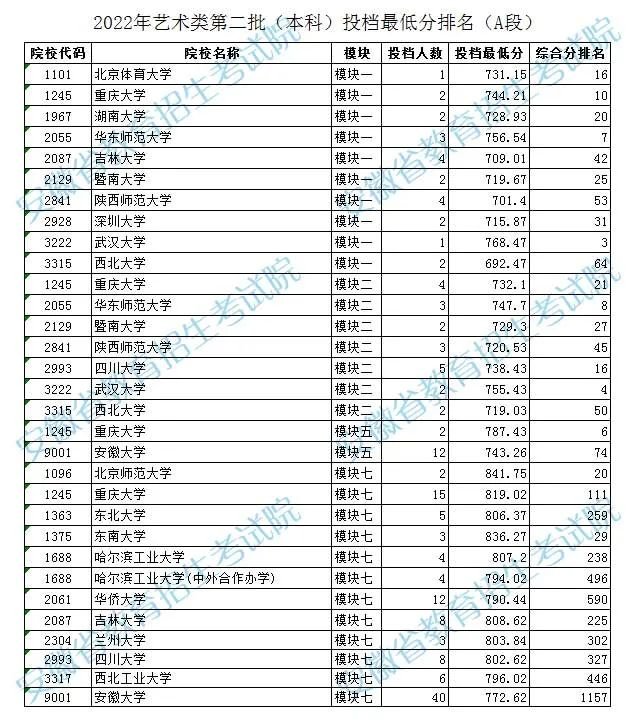 2022年安徽艺术类第二批本科投档最低分排名(A段)