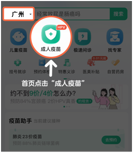 2、下载后,选择“广州”地区,点击 “成人疫苗” ,点击“抢苗助手”。