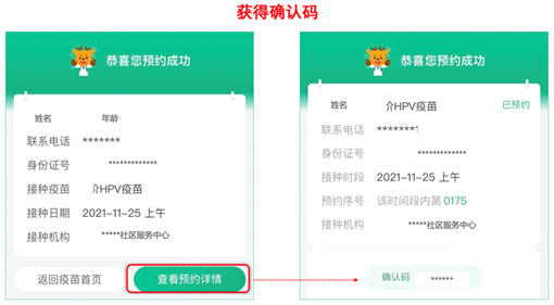 预约成功后,点击“查看预约详情”,获得确认码,之后请携带相关证件,按预约时间准时前往接种点接种。