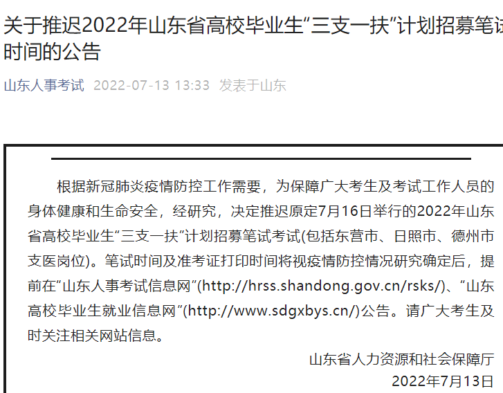 关于推迟2022年山东省高校毕业生三支一扶计划招募笔试时间的公告