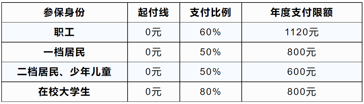 ⭐参保职工支付比例为60%,一个年度内最高支付限额1120元;
