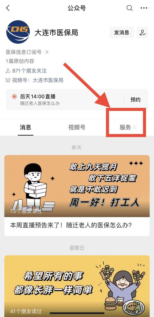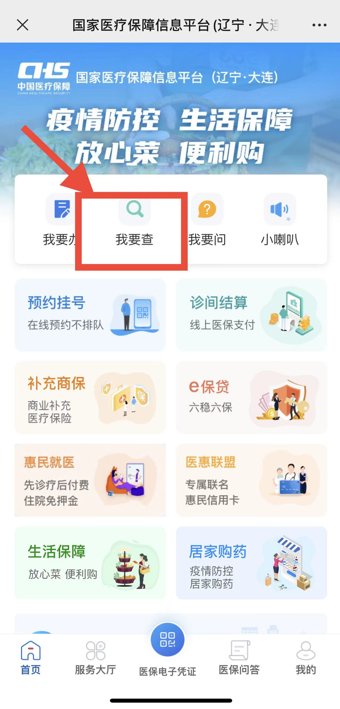 首先,关注“大连市医保局”微信公众号,点击“服务”,点击“我要查”