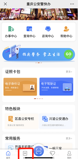 第一步:微信搜索并关注“警快办”;关注后在底部菜单栏位置点击“警快办”进入办事中心;