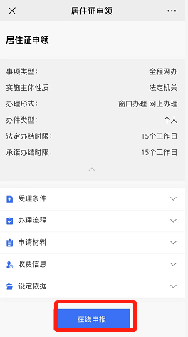 第四步:点击“居住证申领(全程网办)”,进入居住证申领界面,点击“在线申报”,根据提示进行操作即可申请。