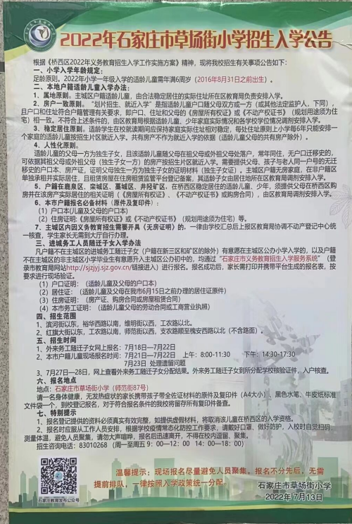 2022石家庄草场街小学招生简章如下: