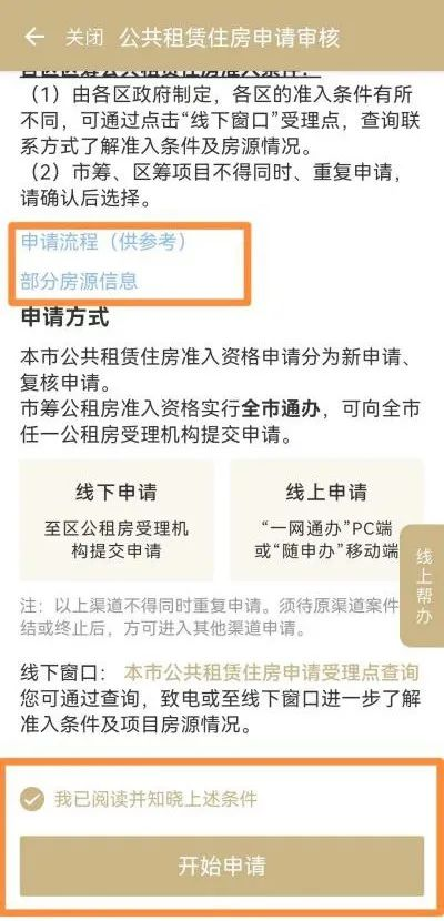 2、进入该事项后选择“公租房新申请”,在准入条件告知页面点阅中部的“申请流程(供参考)”、“部分房源信息”后,点击“开始申请”。