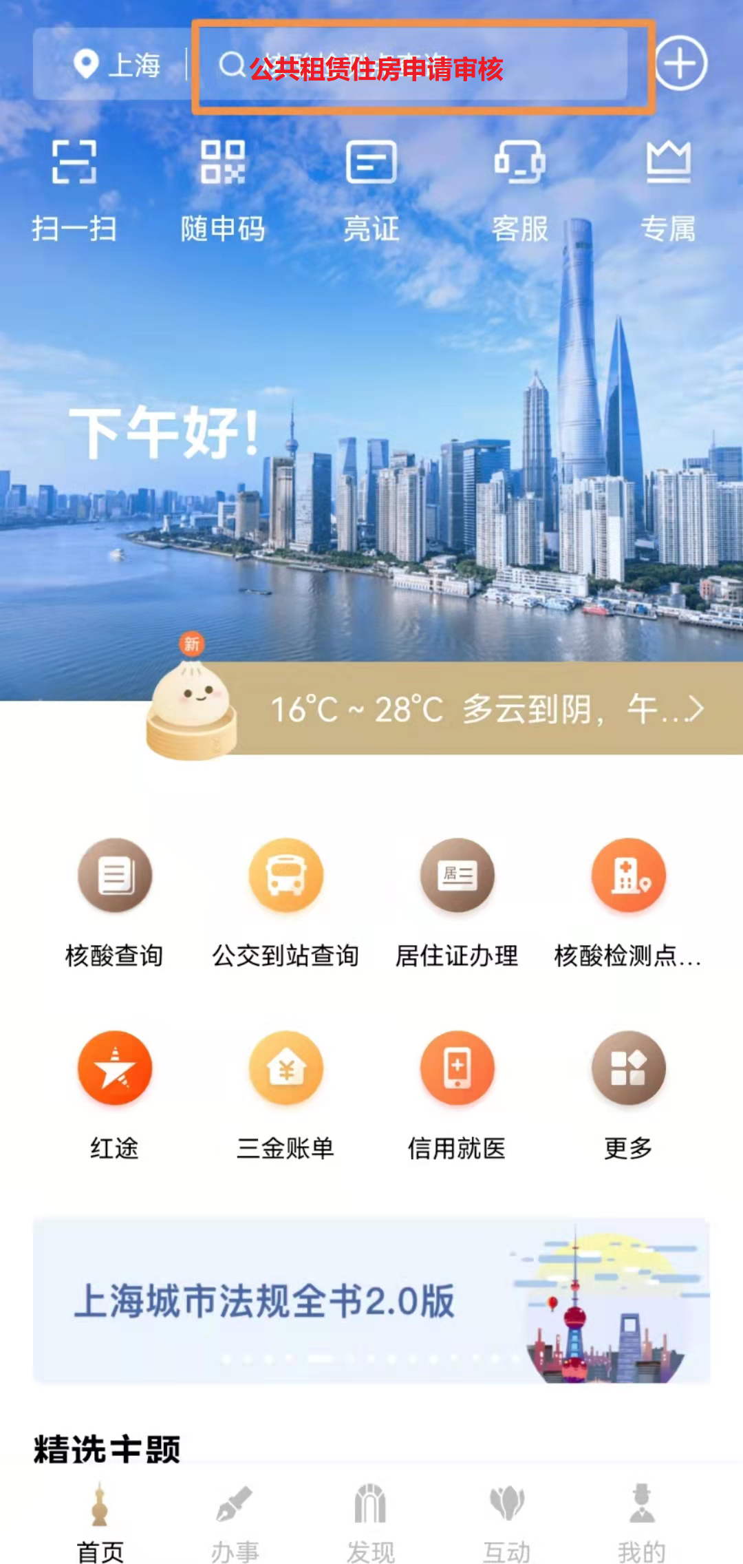 1、手机“随申办市民云”app搜索栏输入“公租房”,在搜索结果中选择并点击“公共租赁住房申请审核”。