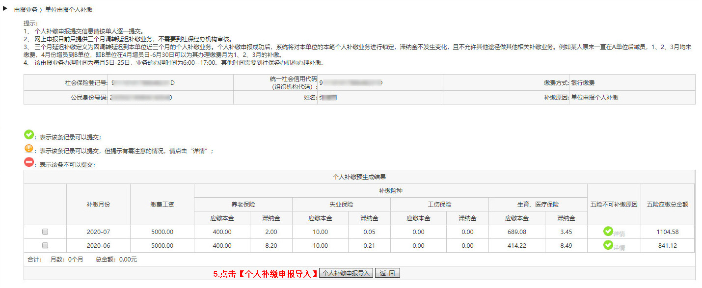 6.系统弹出确认信息提示,点击【确定】按钮后,系统显示个人补缴申报导入反馈界面;
