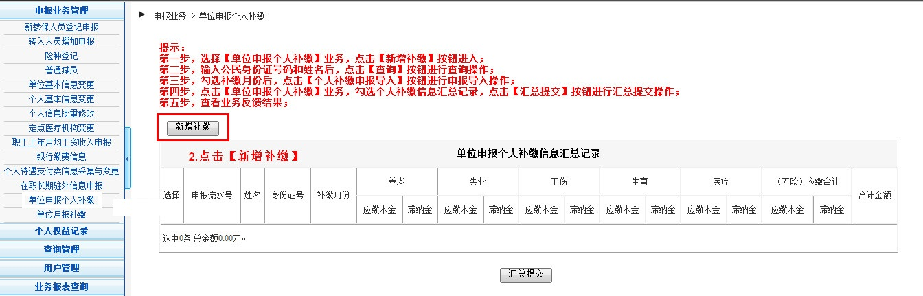7.再次点击【单位申报个人补缴】业务,勾选个人补缴信息汇总记录;