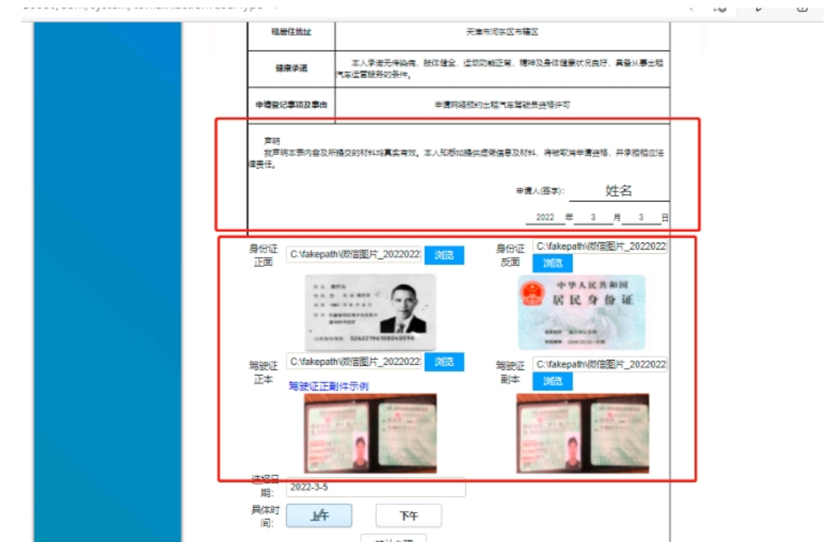(2)【申请表】填写注意事项:①申请人签字处直接填写姓名;②需分别上传申请人身份证正面、身份证反面、驾驶证正页、驾驶证副页附件,对应信息如下图所示。选择日期即为许可申请预约日期,申请人可自行选择。全部填写完成后,点击【确认办理】。