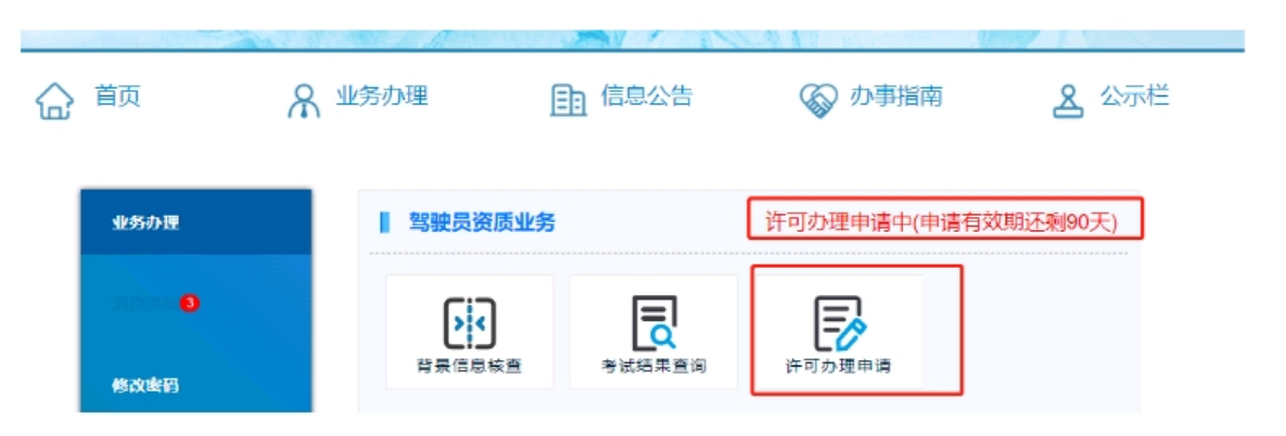 1、【许可办理申请】:考试通过后,【许可办理申请】模块开放,驾驶员点击该模块进行许可申请。