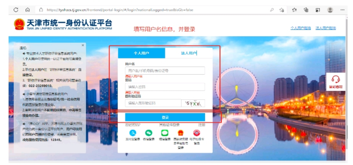 点击以上操作按钮,系统跳转到“天津市统一身份认证平台”进行统一登录。如遇登录问题可联系022-12345、022-88355351