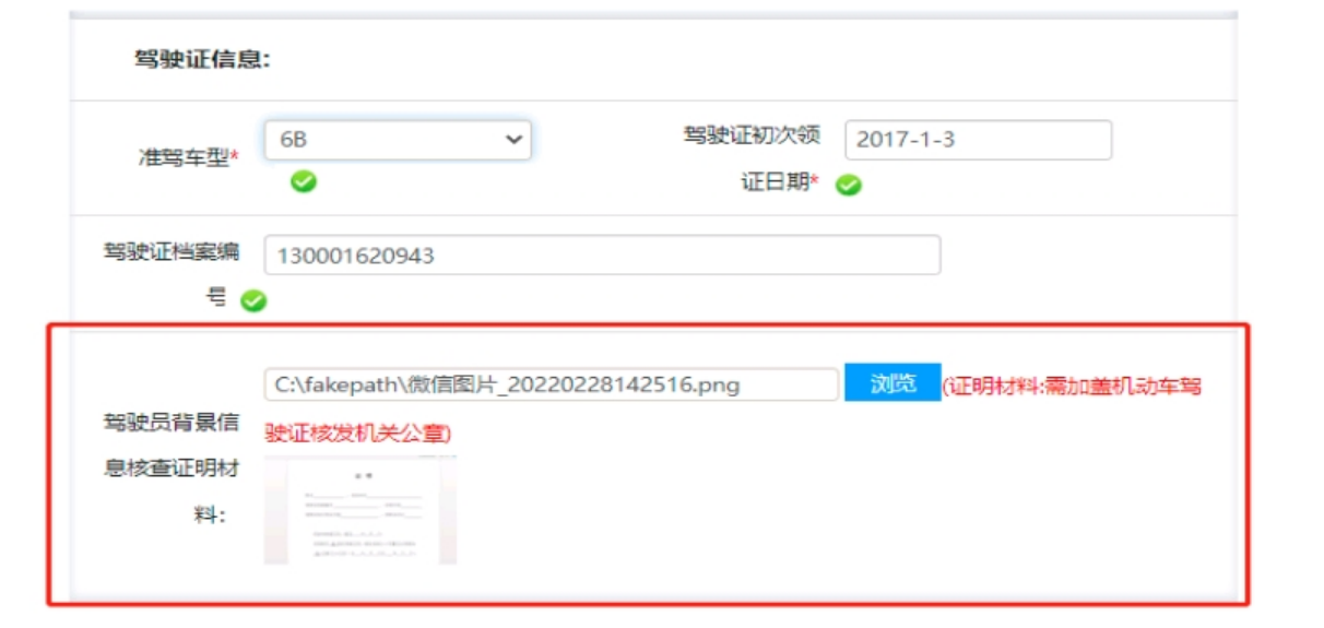 注意!若申请人所持驾驶证非本市核发,还需上传【驾驶员背景信息核查证明材料】,还需加盖机动车驾驶证核发机关公章。