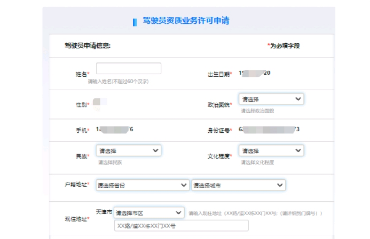 ①【申请背核】∶驾驶员初次申请,点击【申请背核】进行背景信息核查申请,进入下图所示界面填写【驾驶员资质业务许可申请】表。