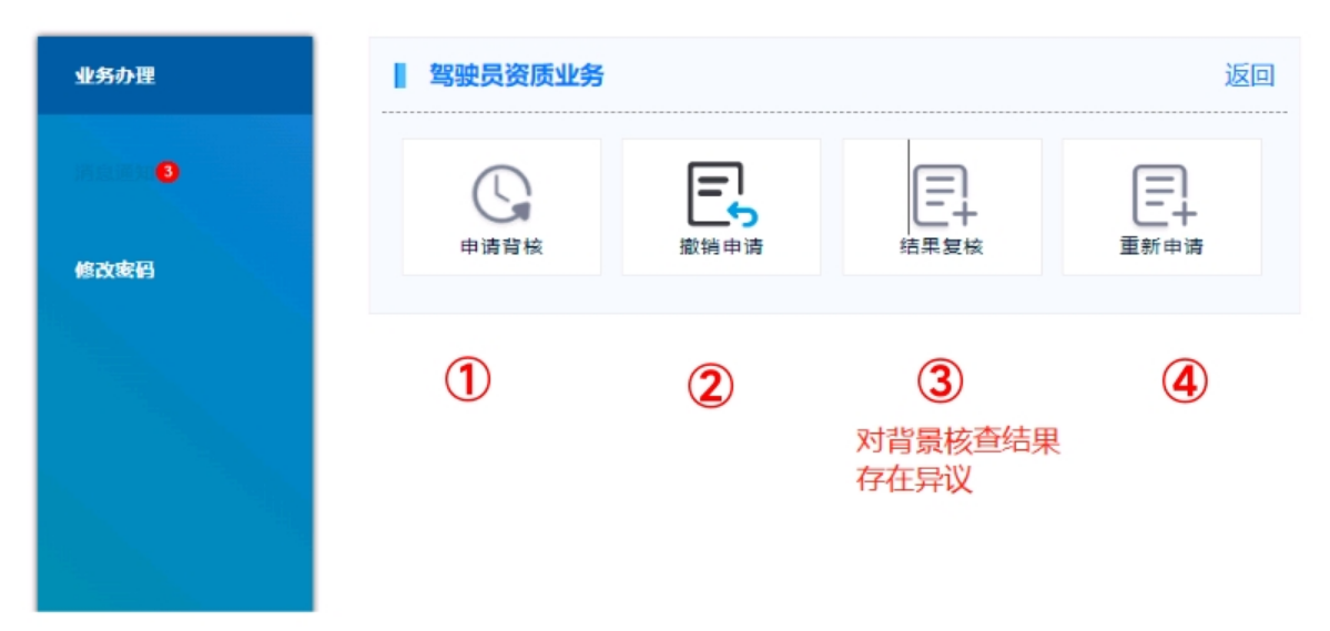 ③【结果复核】:背景核查--身份认证环节若存在异议,驾驶员可通过结果复核向公安复核。(注:只能复核一次,若结果仍不通过,将无法申请网约车驾驶员证)。