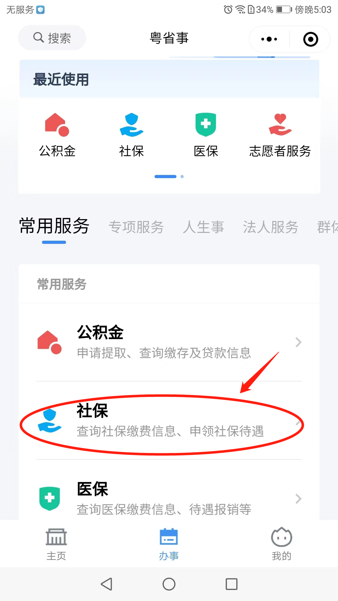 第三步:在【办事】页面中,找到【社保】,如下图所示: