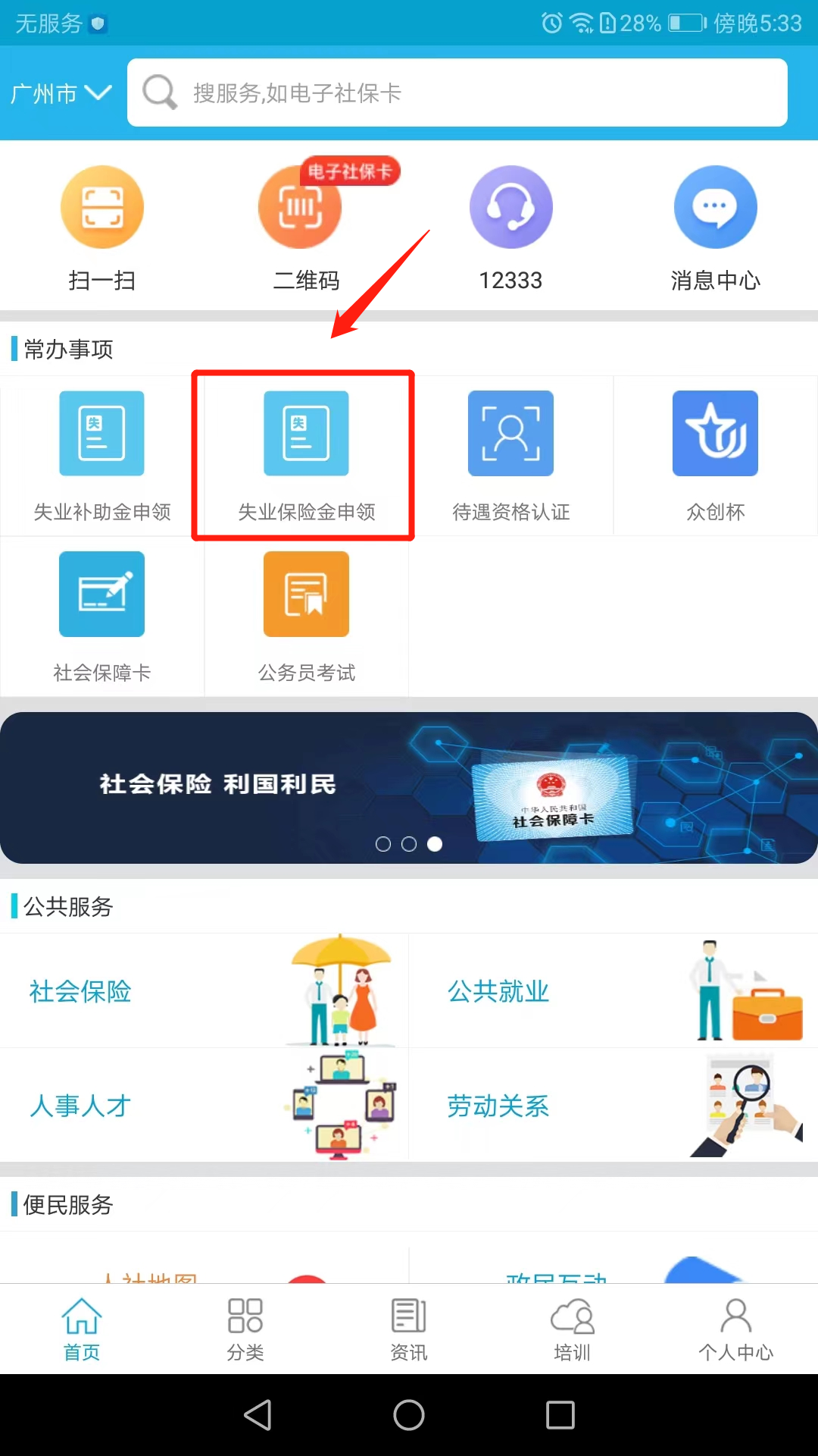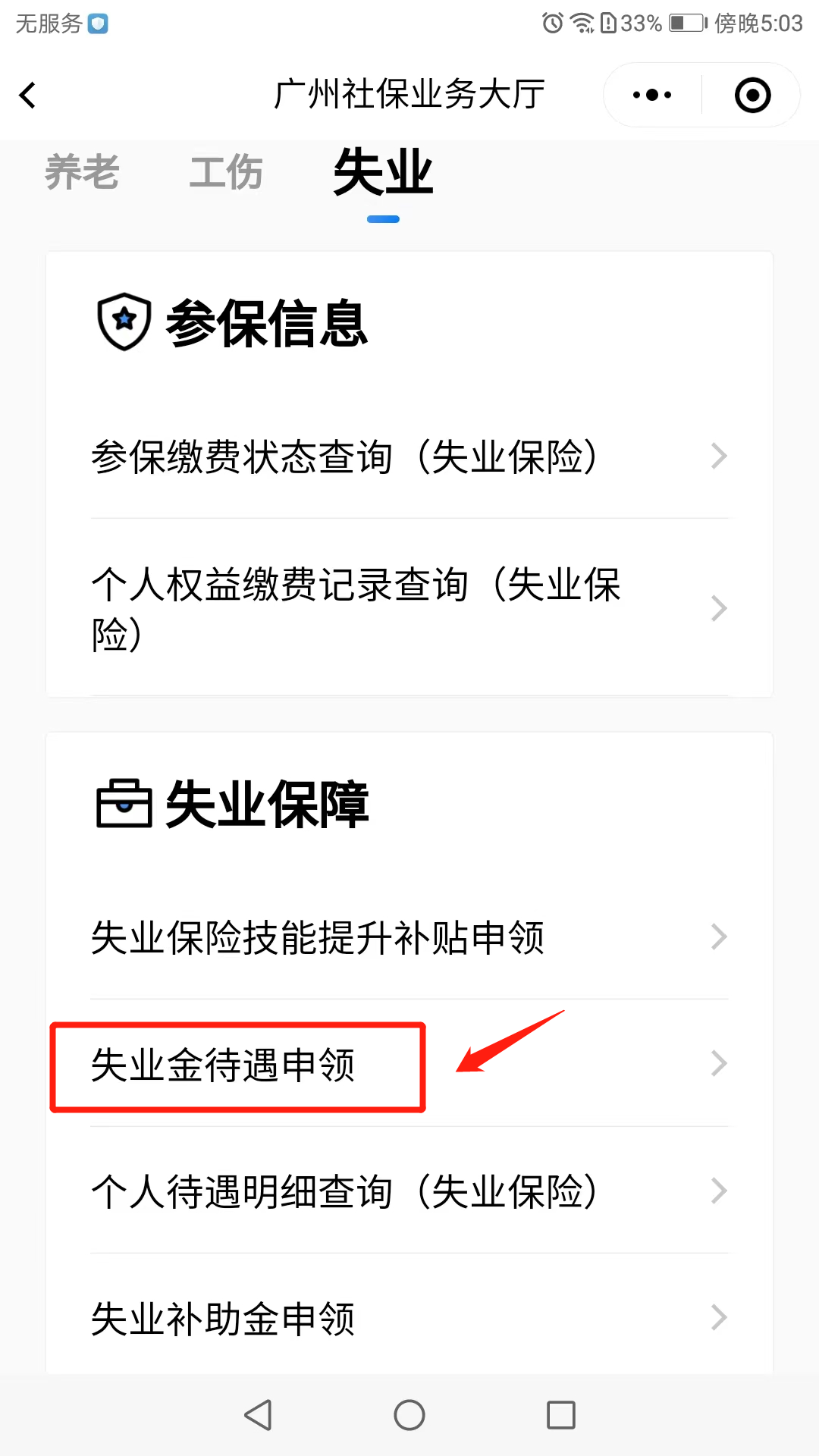 第四步:在【社保】页面中,找到【失业金待遇申领】,如下图所示: