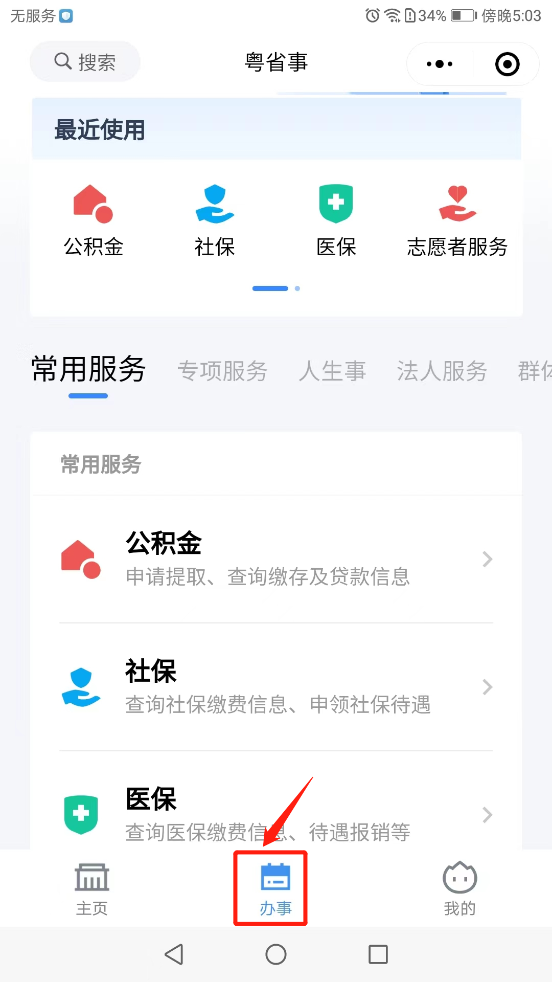 第二步:在粤省事小程序页面中,找到【办事】,如下图所示:
