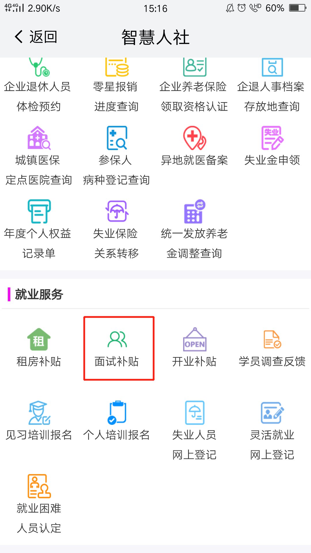 3、下滑至就业服务-面试补贴板块,点击进入,根据后台指引申请。
