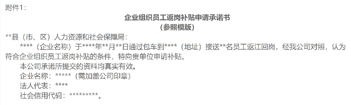 ****(企业名称)于****年**月**日通过包车到****(地址)接送**名员工返江回岗,经我公司对照,认为符合企业组织员工返岗补贴的条件,特向贵单位申请补贴。
