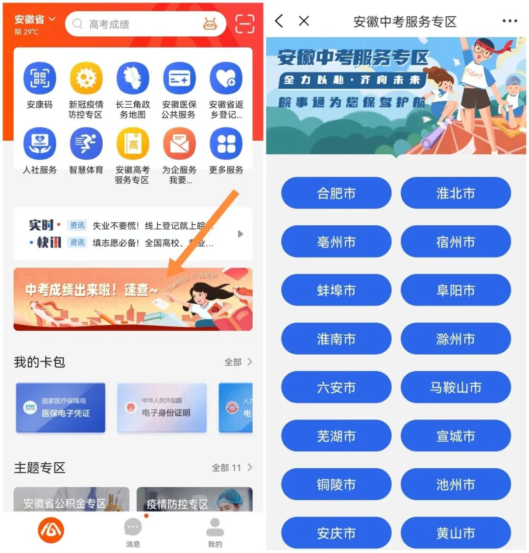 第二步:登录“皖事通”APP,在安徽省分厅点击首页中考服务专区轮播图或者在任一分厅搜索栏搜索关键词“中考”即可进入中考服务专区。