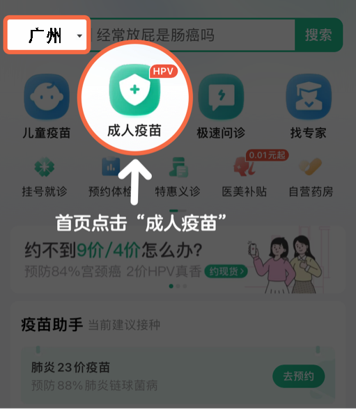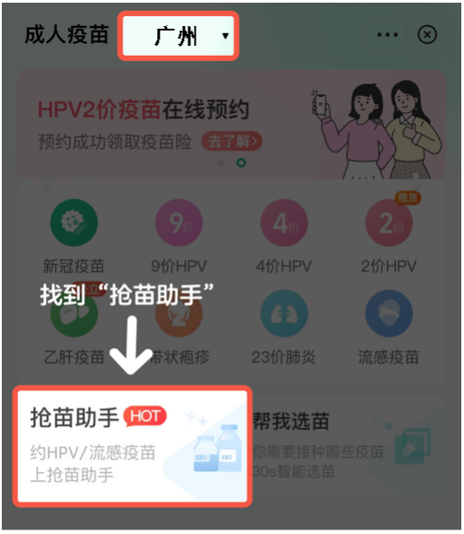 第二步 选择“广州”地区,点击医鹿APP首页 “成人疫苗” ,进入页面后再点击“抢苗助手”。
