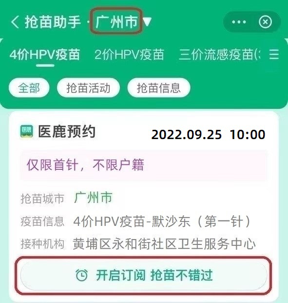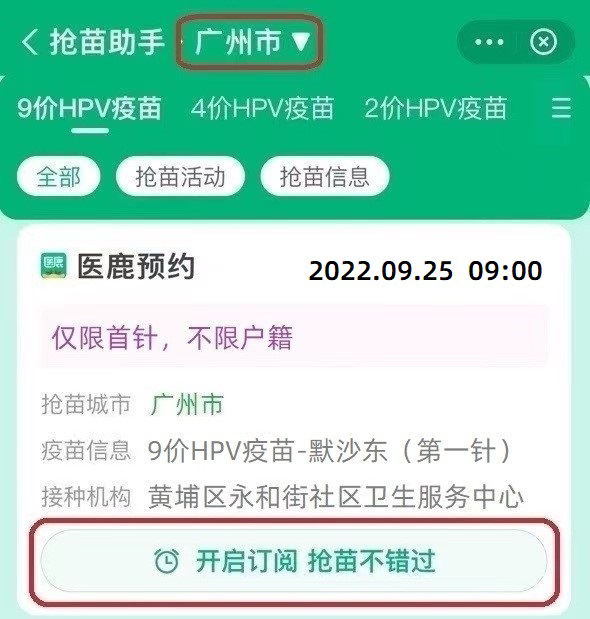 9月25日黄埔区永和街四价九价hpv疫苗首针预约接种通知